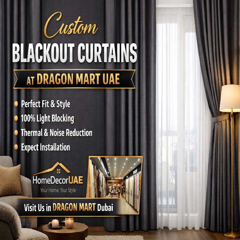 Among the many curtain shops at Dragon Mart, HomeDecorUAE stands out as a trusted and professional provider of custom blackout curtains. HomeDecorUAE is known for its attention to detail, high-quality fabrics, and customer-focused service. The team offers expert guidance in selecting the right blackout material, color, and style based on your space and lighting needs. With accurate measurements, premium stitching, and professional installation, HomeDecorUAE ensures a flawless finish every time. Their competitive pricing, timely delivery, and after-sales support make them one of the best choices at Dragon Mart UAE for custom blackout curtains.
