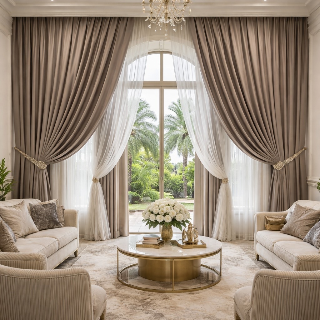 Curtains in this style are usually structured yet soft, with precise pleats and high-quality finishes. Accessories such as chandeliers, gold trims, and decorative cushions add depth and character to the room.