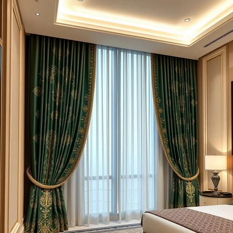 For a more traditional Arabic look, embroidered curtains with gold or silver designs are highly preferred. They add elegance and richness to majlis and formal areas.
