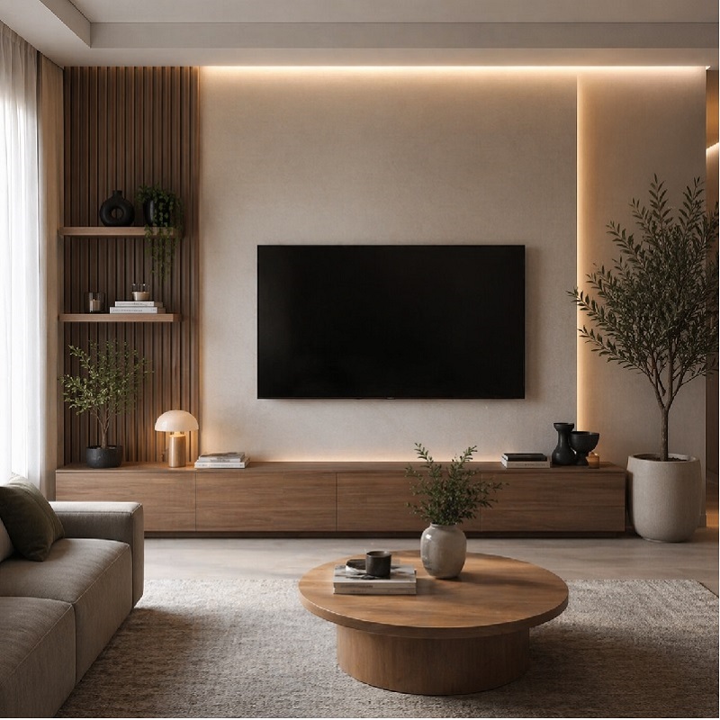 LED lighting is one of the most popular trends in modern TV unit design. Soft lighting behind the panel creates a warm and relaxing atmosphere. This design is perfect for evening gatherings and adds a luxury touch to the space.