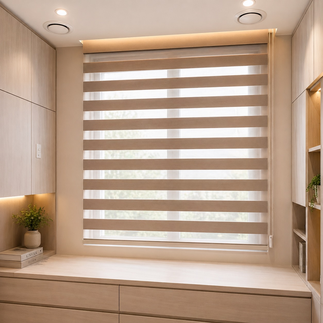 Zebra blinds are one of the most popular choices for modern homes. They feature alternating sheer and solid layers, allowing you to easily control light and privacy. Perfect for living rooms and bedrooms.