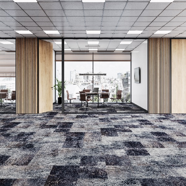 The carpet’s texture appears plush yet dense, suggesting durability and comfort underfoot, which is essential for busy work areas. It is likely constructed from materials designed to withstand heavy foot traffic while maintaining its appearance over time. The tile-like format not only offers a cutting-edge aesthetic but also provides functional benefits, as individual tiles can be replaced if damaged, reducing maintenance costs and time. This carpet flooring seamlessly ties together the modern aesthetic of the room, complementing the wood and glass partitions and the sleek office furniture. It is an excellent choice for businesses looking to create a professional, stylish, and long-lasting impression.