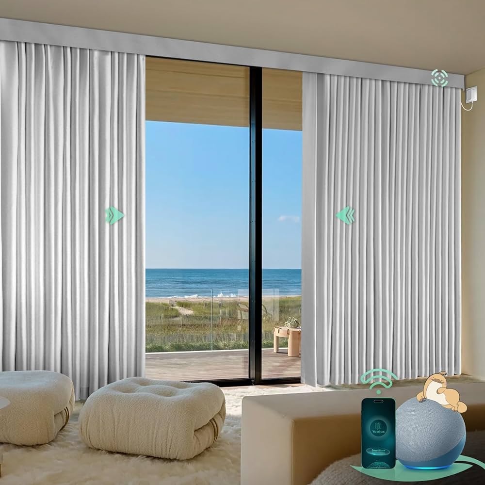The graphics indicate they are smart curtains, meaning they can be opened and closed using voice commands via a smart speaker or a smartphone app. This convenience makes them ideal for controlling light and mood in this bright, minimalist space.